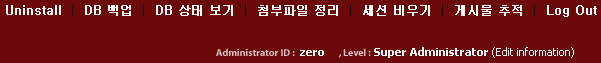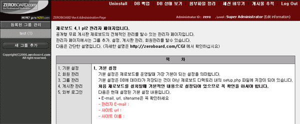 관리자 페이지 요약 2. 제로보드의 관리자 페이지 화면은 다음과 같습니다 2. 2. 메뉴는 왼쪽의 그룹별 관리 메뉴와 상단의 전체 관리 메뉴가 있습니다 2. 2. 위 그림은 상단 전체 관리 메뉴의 그림입니다 2. 전체 관리 메뉴는 최고 관리자만이 사용할수 있습니다 2. Uninstall : 제로보드의 DB와 파일을 모두 제거하는 메뉴입니다 2. DB 백업 : 제로보드가 사용하고 있는 DB를 백업하는 기능입니다 2. DB 상태보기 : 제로보드가 사용하고 있는 DB의 상태를 볼수 있습니다 2. 첨부파일 정리 : 첨부파일을 정리하고 쓰레기 파일을 삭제할수 있습니다 2. 세션 비우기 : 인증시 필요한 세션파일을 모두 지울수 있습니다 2. 게시물 추적 : 전체 게시판에서 키워들 이용하여 게시물 추적을 할수 있습니다 2. 2. 왼쪽의 그룹 관리 메뉴입니다 2. 그룹을 생성한후 선택이 되면 하위 메뉴들이 나타납니다 2. 그룹설정: 그룹 설정을 할수 있습니다 2. 삭제: 그룹을 삭제합니다 2. 회원관리: 회원의 목록을 보고 관리할수 있고 전체메일을 보낼수 있습니다 2. 가입폼: 회원 가입폼의 항목을 설정합니다 2. 게시판 관리: 게시판의 목록을 보고 관리를 할수 있습니다 2. 추가: 게시판을 추가합니다 2. 새 그룹 추가: 새로운 그룹을 추가할수 있습니다
