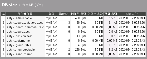3. 제로보드가 사용하고 있는 전체 DB용량을 볼수 있으며 각 테이블별로 현황을 볼수 있습니다.
