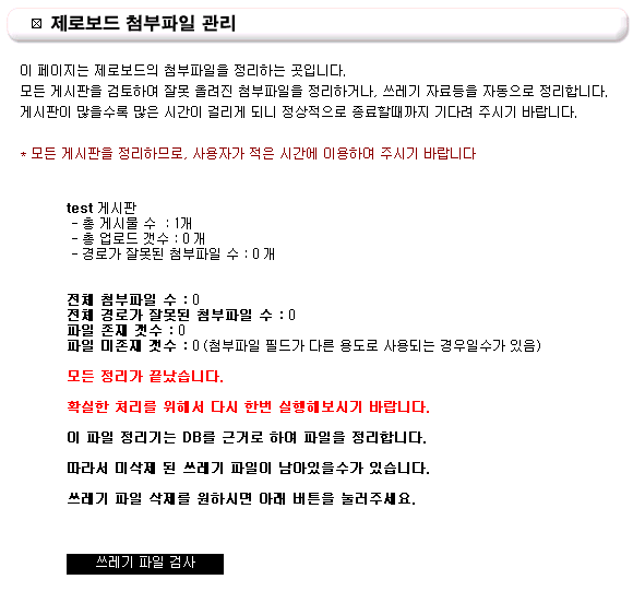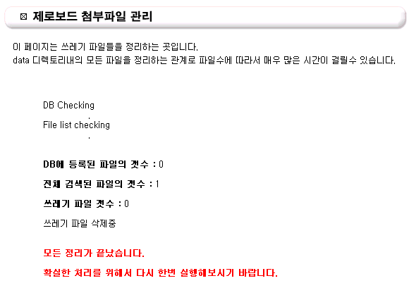 첨부파일 정리 2. 제로보드를 이용하여 자료등을 업로드 하게 되면 data 라는 디렉토리에 파일이 저장됩니다 2. 제로보드 4.1 pl2부터는 거의 모든 상황에 대처하여 첨부파일을 관리할 수 있지만 2. 간혹 지워야 하는데 지워지지 않는 파일이 생길수도 있고, 2. 이전 버젼의 경우 많은 쓰레기 파일들이 존재할 수도 있습니다 2. 제로보드 4.1 pl2의 첨부파일 정리기능을 이용하여 깔끔하게 data 디렉토리를 2. 정리할수 있으며, 쓰레기 파일들을 삭제할수 있습니다. 2. 이 첨부파일 정리 기능은 파일이나 게시판이 많을 경우 많은 시간이 걸리니 2. 사용자가 적은 새벽시간대에 이용하여 주시기 바랍니다. 2. 첨부파일 관리 메뉴를 누르면 다음과 같이 1차적으로 DB의 내용을 근거로 하여 2. 첨부파일을 data/게시판ID/파일이름 처럼 깨끗하게 정리를 합니다 2. 2. 이 화면에서 아래에 있는 쓰레기 파일 검사 버튼을 누르게 되면 삭제하여야 2. 파일을 검사한후 쓰레기 파일을 삭제합니다 2. 2. 위와 같이 쓰레기 파일까지 모두 정리를 할수 있습니다