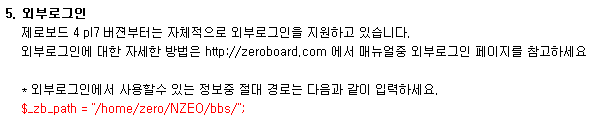 외부 로그인 사용법 제로보드에서는 다음이나 드림위즈등과 같이 회원가입이나 로그인등을 처리할수 있는 기능을 제공하고 있습니다 제로보드에서는 그 기능을 외부로그인이라고 지칭하며 매우 간단한 방법으로 사용할수 있습니다 그리고 외부로그인의 경우 별도로 스킨을 이용할수 있도록 제작되어 있어서 많은 사용자들이 스킨을 공유하고 있습니다 외부로그인 스킨은 제로보드 설치 디렉토리의 outlogin_skin디렉토리에서 이용합니다 마음에 드는 외부로그인 스킨을 outlogin_skin 디렉토리에 업로드 하신후 아래 방법에 따라서 적용하시면 됩니다 외부로그인을 설치하기 위해서는 제로보드가 설치된 절대경로를 알아야 합니다 이 절대경로는 제로보드 관리자 페이지를 보면 나타나 있습니다