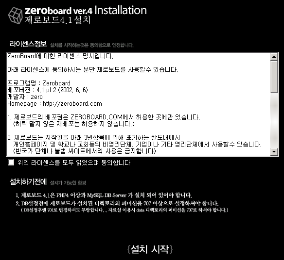 제로보드 설치하기 이제 제로보드를 자신의 계정에 직접 설치를 하여 봅시다. 우선 http://zeroboard.com 에서 제로보드를 다운 받으셔야겠지요? 제로보드는 .zip 파일과 .tar.Z 파일 2가지로 배포하고 있습니다. 리눅스에서 쉘명령어를 아시는 분은 .tar.Z 파일을 받아서 계정에 올린후 압축을 푸는것이 쉽습니다. 쉘명령어를 모르시는 분들을 대상으로 설명 하도록 하겠습니다. 1. 다운 받은 제로보드 zip 파일의 압축을 푸세요. 1. 압축을 풀면 bbs 이라는 디렉토리가 생성이 됩니다. 2. bbs 디렉토리를 자신의 계정으로 업로드를 합니다. 2. 업로드는 FTP 프로그램을 이용하시면 됩니다. 3. FTP에서 bbs 의 디렉토리의 퍼미션을 777로 설정합니다. 3. 저는 CuteFTP 를 이용하기 때문에 CuteFTP로 예를 들도록 하겠습니다. 3. 아래 그림을 보시면 bbs 디렉토리에 왼쪽 버튼을 클릭하였을 경우 Change file attributes 라는 3. 메뉴가 있습니다. 3. 물론 각 FTP 프로그램마다 용어가 다를수 있지만 대동소이 하니 잘 찾아보세요. ^^ ![]() 3. 이 메뉴를 클릭하면 다음과 같은 그림이 나타납니다. ![]() 3. CuteFTP는 위와 같이 체크를 하거나 직접 입력할수 있게 되어 있습니다. 3. 체크하는 방식이든 숫자를 입력하는 방식이든 모두 체크하거나 777로 입력하세요. 3. 여기 까지 되었다면 반은 성공한것입니다. 4. 이제 제로보드를 설치하여 보겠습니다. 4. 제로보드의 install.php 를 실행하여 제로보드 설치를 시작합니다. 4. 아래 그림처럼 브라우저를 여시고 제로보드의 install.php 부르세요. 4. http://자신의계정도메인/제로보드디렉토리/install.php 라고 하시면 됩니다. ![]() 4. 위의 방법으로 입력하였을때 다음과 같은 화면이 나타납니다. ![]() 4. 만약 위와 같이 {설치 시작} 버튼이 나타나지 않고 아래와 같은 표시가 나타난다면 퍼미션을 4. 제대로 지정해야 합니다. ![]() 4. {설치 시작} 버튼이 나타났다면 버튼을 눌러서 설치를 시작합니다. 5. MySQL DB 설정 하기 5. 다음 페이지로 이동하면 아래와 같이 MySQL DB 를 설정하는 화면이 나옵니다. ![]() 5. 계정에서 MySQLl을 지원하면 이미 HostName, SQL UserID, Password, DB Name을 알고 있으실겁니다. 5. 만약 내가 속해 있는 계정에는 이런 것에 대해서 언급이 없었다면 지원을 하지 않는 경우일테니 5. 서버 관리자나 계정 담당자에게 확인을 하시기 바랍니다. 5. 그럼 위의 MySQL DB 정보를 입력하고 {설정 완료} 버튼을 누르세요. 6. 최고 관리자 정보 입력하기 6. MySQL DB 입력이 정상적으로 이루어졌다면 아래와 같이 기본으로 이용될 최고 관리자 정보 입력화면이 나옵니다. ![]() 6. 관리자로 사용을 원하시는 ID, 비밀번호, 이름을 입력하시고 {정보 입력 완료} 버튼을 누르세요. 6. 지금 입력하시는 관리자 ID는 계속 사용해야 하며, 분실시 관리자 화면으로 들어 갈수 없으니 꼭 6. 기억하셔야 합니다. 7. 설치 완료 7. 아래와 같이 제로보드 관리자의 인증을 요구하는 페이지가 나온다면 제로보드의 설치는 완료 된것입니다. ![]() 7. 조금전에 입력한 관리자 정보로 로그인을 하시면 관리자 페이지가 나타납니다. 이제 기본적인 설치는 성공하였습니다. 설치를 하신후에 setup.php 의 내용을 고쳐주셔야 합니다. 옆에 2번째 메뉴, * 설치후 확인사항 을 꼭 읽어보세요. |