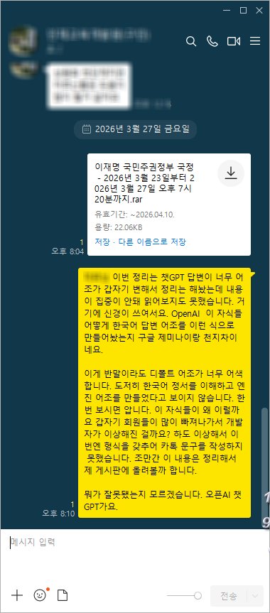 | · Subject : [쓰레기통] 오픈AI 챗GPT 뭐가 잘못돼서 이럴까요? 헐~ 오늘 하도 어조가 이상해 계속 신경이 쓰여 내용은 읽어보지도 못했습니다. 누가 답변 좀... ㅡ_ㅡ |